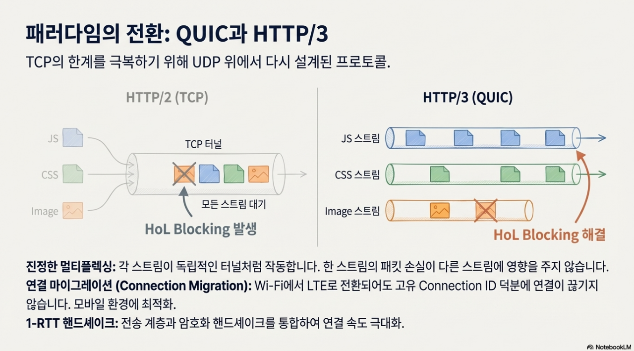 - HTTP/3 (QUIC): UDP 위에 TCP의 장점(신뢰성, 암호화)을 재구현하여, TCP의 HoL Blocking 문제를 근본적으로 해결했습니다.