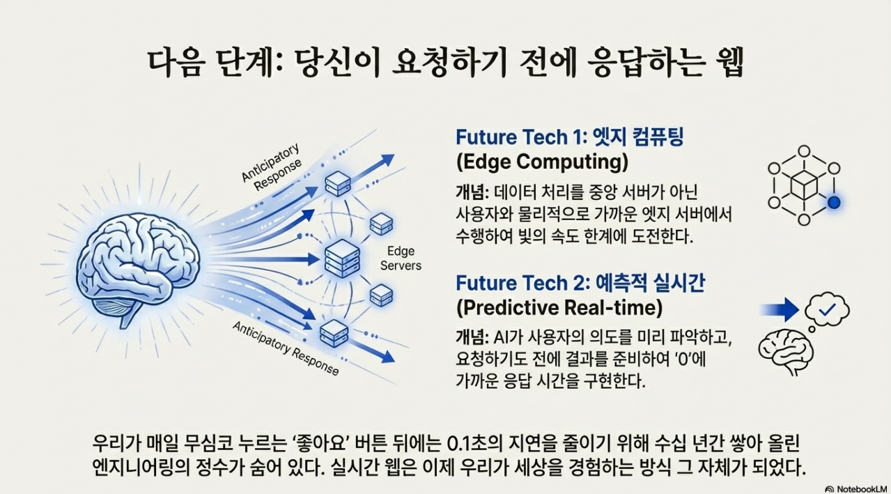 미래의 웹은 엣지 컴퓨팅과 결합하여 물리적 거리의 한계를 극복하고, AI 에이전트의 도입으로 사용자의 의도를 미리 파악하는 '예측적 실시간(Predictive Real-time)' 시대로 진입할 것입니다.