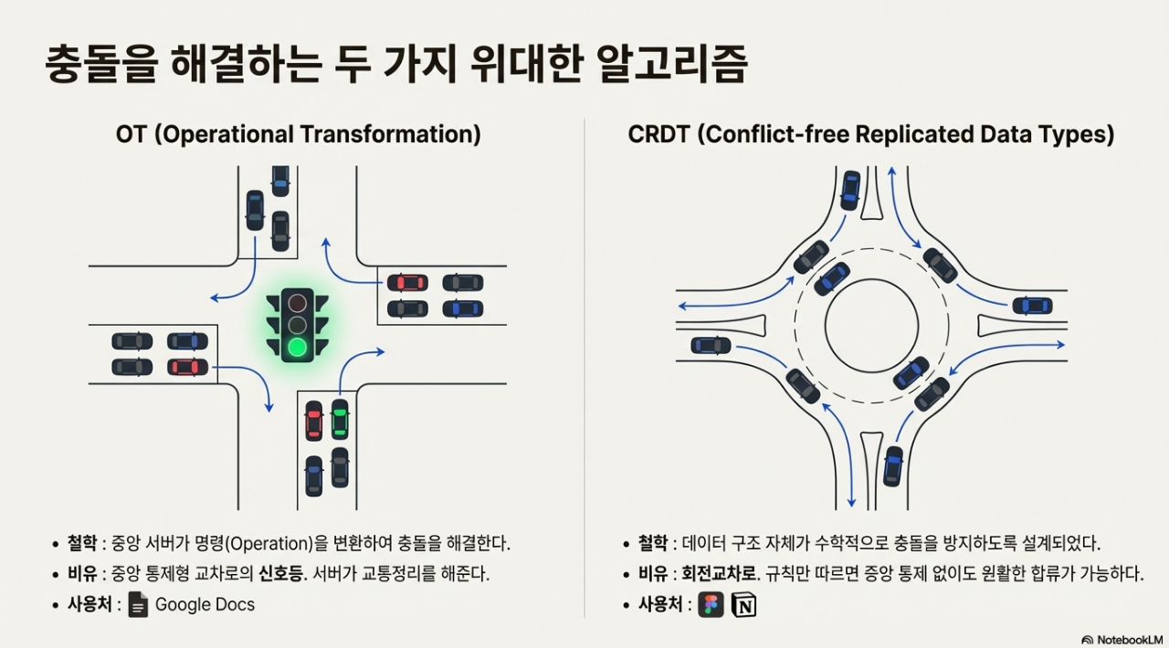 | OT / CRDT | 동시 편집 충돌 해결 알고리즘 | 신호등(OT) vs 회전교차로(CRDT) |