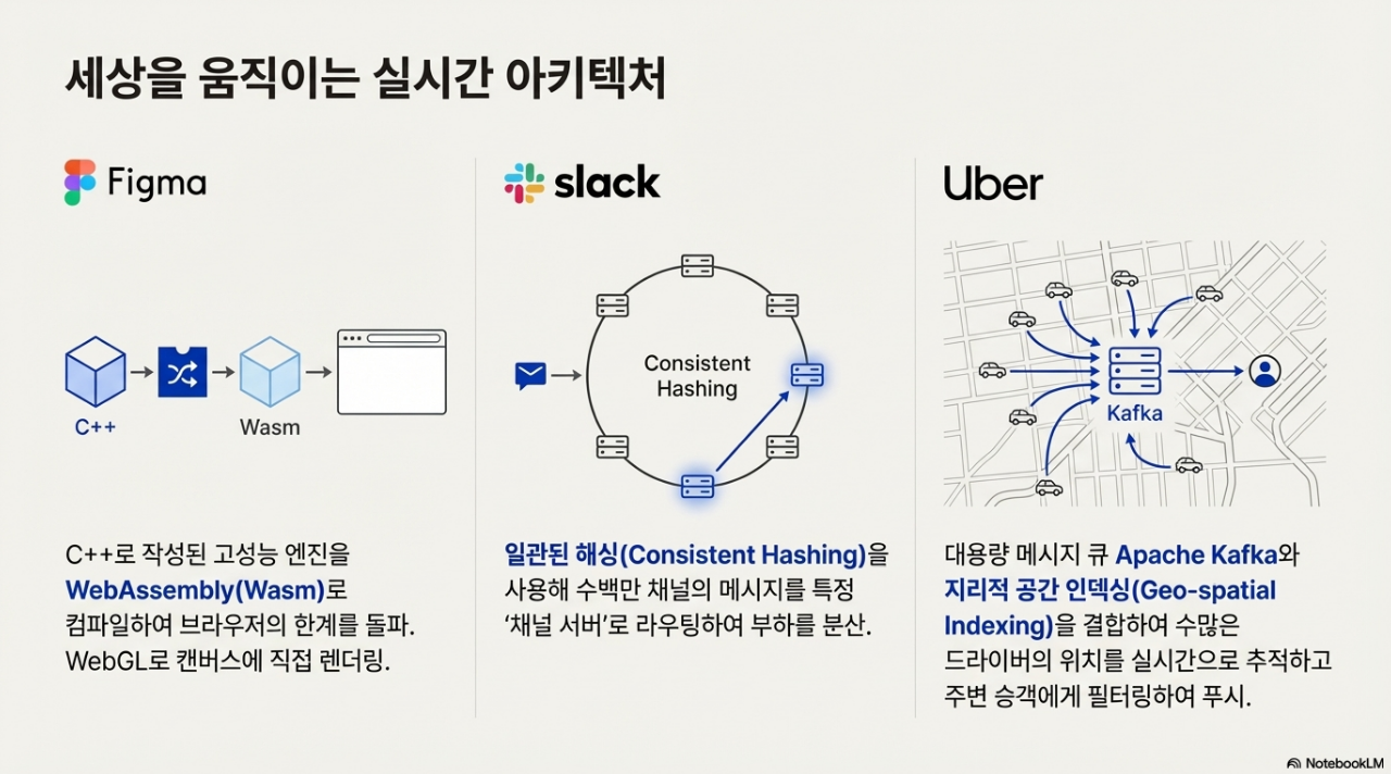 - 슬랙(Slack): 수백만 채널의 메시지를 처리하기 위해 일관된 해싱(Consistent Hashing)을 사용합니다. 특정 채널의 처리를 특정 '채널 서버'에 전담시켜 부하를 분산하고 대규모 동시 접속자를 처리합니다.
