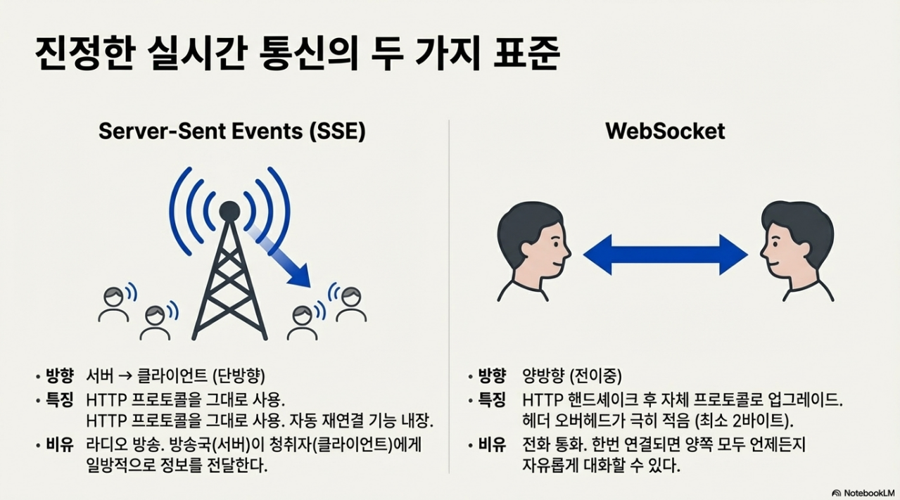 - 기술적 도약 (Availability): WebSocket, SSE 등 성숙한 기술들이 HTTP의 한계를 극복했습니다.