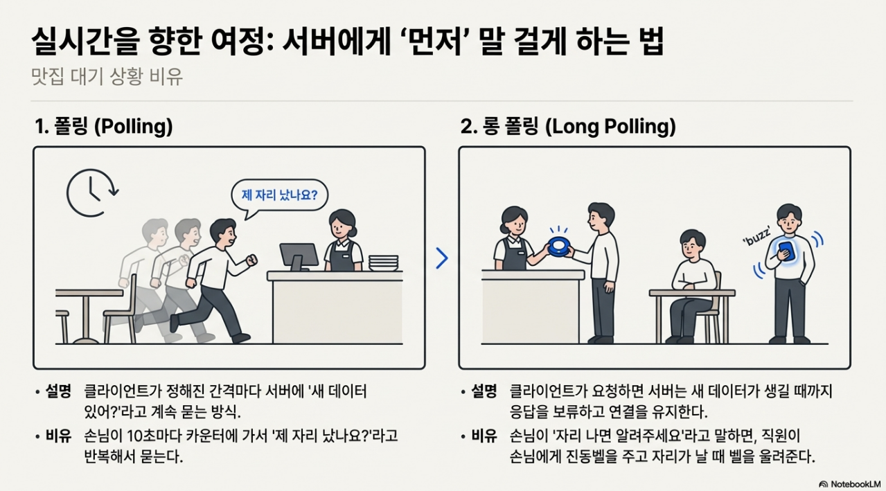 서버가 클라이언트에게 데이터를 밀어 넣는(Push) 기능을 구현하기 위해, 개발자들은 HTTP 위에서 기발한 해법들을 고안했습니다. 이를 '유명 맛집의 대기 상황'에 비유하여 설명할 수 있습니다.