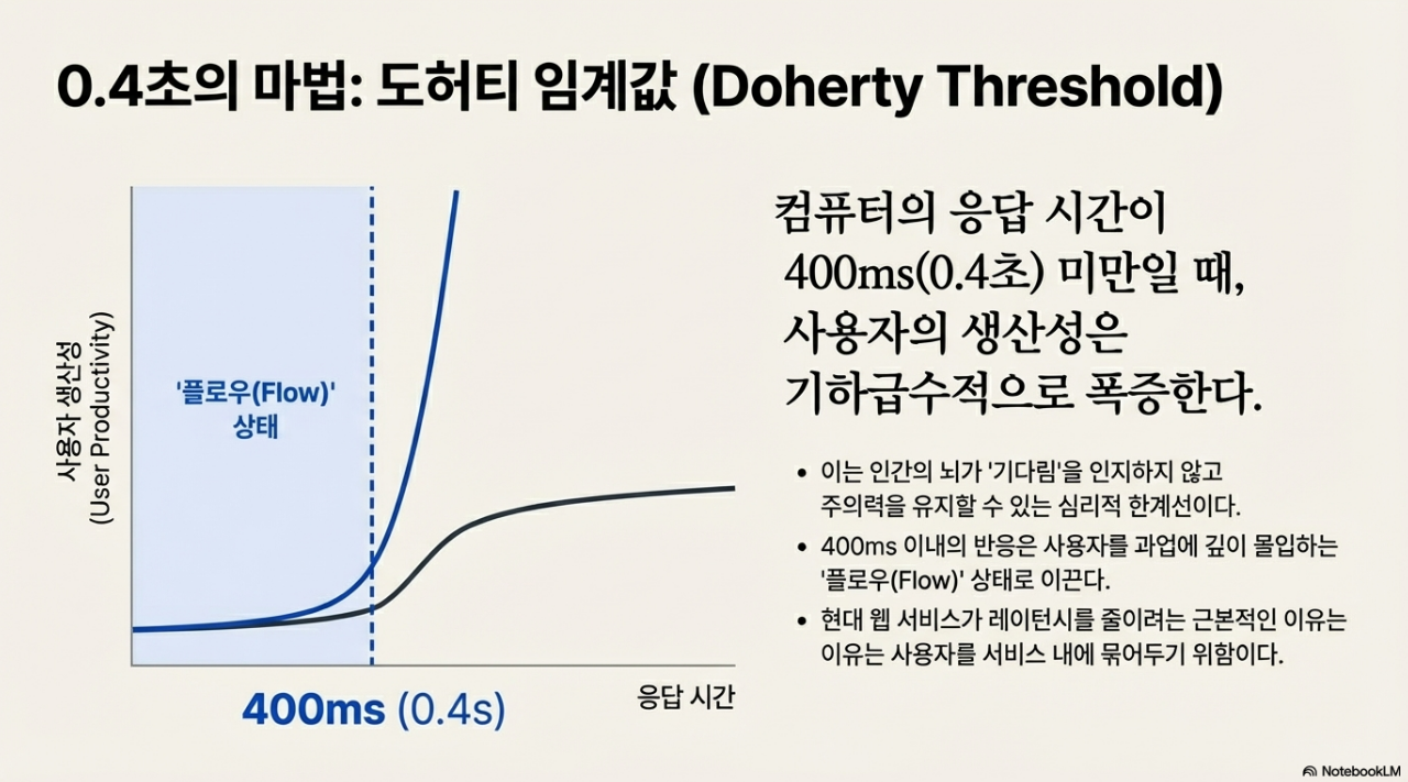 1982년, IBM의 연구원 월터 J. 도허티(Walter J. Doherty)와 아르빈드 J. 타다니(Ahrvind J. Thadani)는 시스템 응답 시간과 사용자 생산성 사이의 놀라운 관계를 발견했습니다. 응답 시간이 400밀리초(0.4초) 미만으로 떨어질 때, 사용자의 생산성이 기하급수적으로 폭증한다는 사실을 밝혀낸 것입니다.