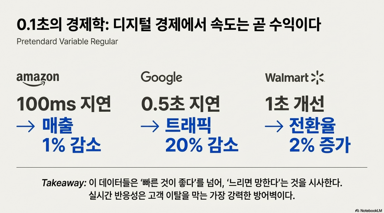 | Amazon | 100ms(0.1초) 지연 시 매출 1% 감소 | 연 매출 수백조 원 규모에서 1%는 수조 원에 달함. |