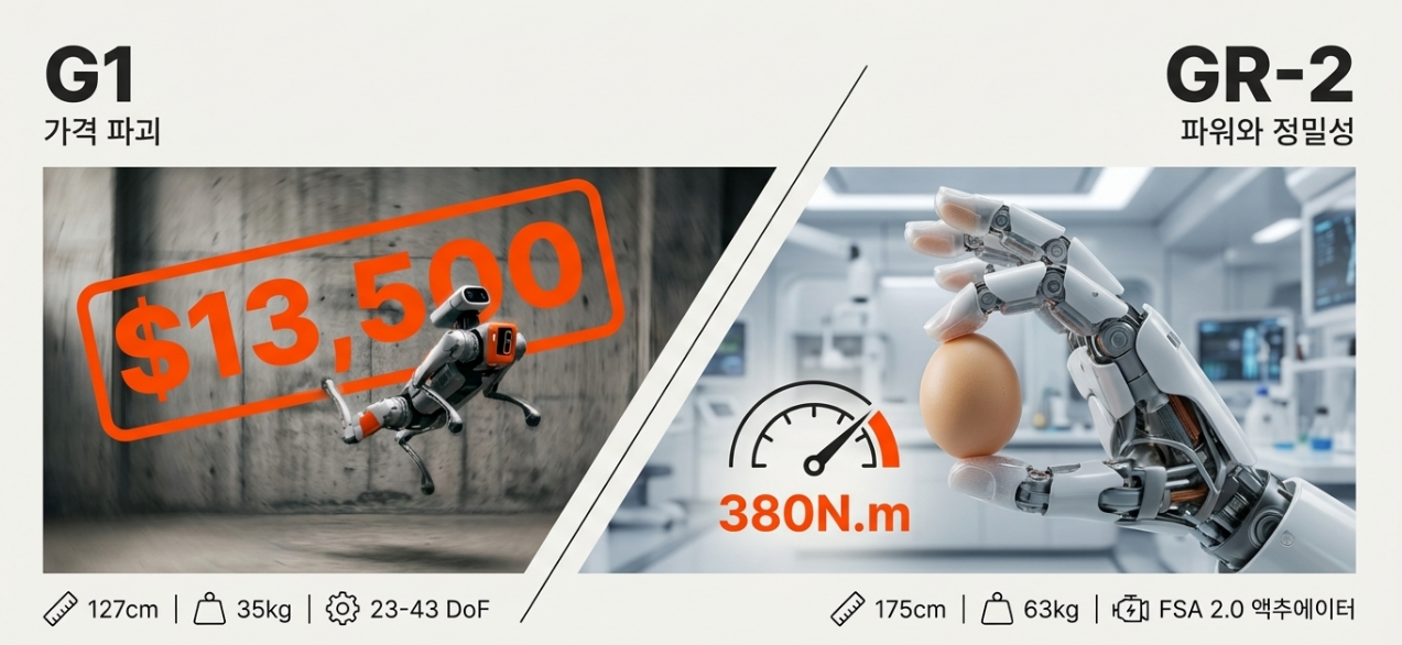 - 유니트리 G1 - 가격 파괴 전략: 유니트리의 'G1' 은 13,500달러(약 1,900만 원)라는 충격적인 시작 가격으로 휴머노이드 로봇 시장의 패러다임을 바꾸고 있습니다. 키 127cm, 무게 35kg의 컴팩트한 사이즈에 3D 라이다와 깊이 카메라를 탑재했으며, 눕혀진 상태에서 잉어킹처럼 튀어 오르는(Carp Kip-up) 고난도 동작이 가능할 정도로 뛰어난 모터 제어 능력을 자랑합니다. 수억 원을 호가하던 로봇 가격을 소형차 수준으로 낮춤으로써, 전문 연구소를 넘어 얼리어답터 개인까지 고객층을 확장하며 시장 자체의 크기를 키우는 '가격 파괴' 전략을 구사합니다.