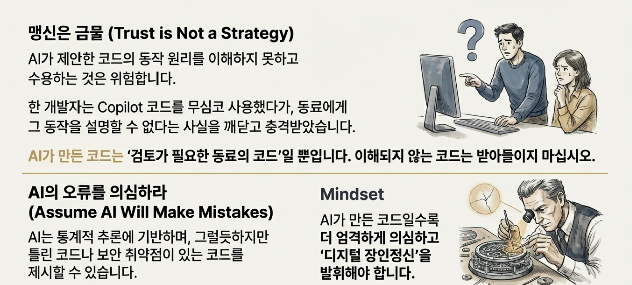 AI가 제시한 코드가 깔끔하고 그럴듯해 보여도, 개발자가 그 코드의 동작 원리를 이해하지 못하면 큰 문제가 돼요 . 한 개발자는 Copilot 코드를 생각 없이 받아들였다가, 나중에 동료에게 그 코드를 설명하지 못해 충격을 받았다고 해요 . AI가 만든 코드 역시 '검토가 필요한 또 다른 개발자의 코드'일 뿐이라는 인식이 중요해요 .