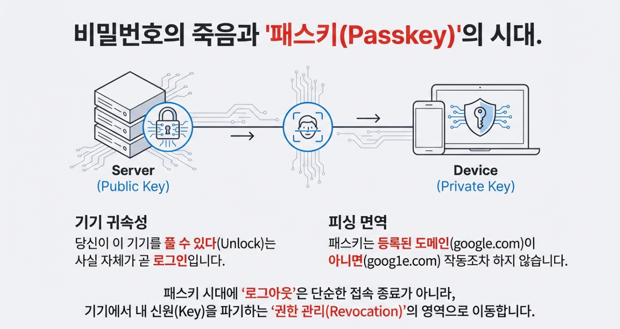 패스키가 보편화된 미래에는 '로그인'이라는 행위 자체가 사라집니다. 이때 '로그아웃'은 세션을 잠시 끊는 행위가 아니라, "내 기기에서 이 서비스의 접근 권한을 영구히 삭제하는" 관리자 수준의 행위로 그 의미가 바뀌게 될 것입니다. 또한 패스키는 특정 웹사이트 주소에 귀속되기 때문에, 정교한 피싱 사이트를 원천적으로 차단하는 강력한 보안 기능까지 갖추고 있습니다.