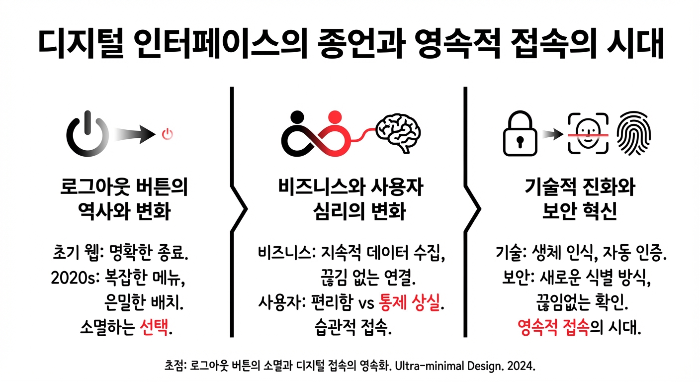 로그아웃 버튼의 소멸은 단순한 UI 디자인의 변화가 아닙니다. 이는 비즈니스의 생존 전략, 보안에 대한 인식 변화, 사용자 심리, UX 패러다임, 그리고 기술의 발전이 맞물려 일어난 거대한 패러다임의 전환입니다.