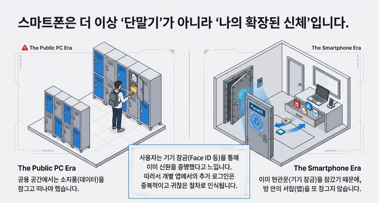 "사용자들의 멘탈 모델 속에서 스마트폰은 더 이상 '접속하는 단말기'가 아니라 '나의 확장된 신체'입니다. 내 방(스마트폰)에 들어올 때 현관문(기기 잠금)을 열었다면, 방 안의 서랍(앱)을 열 때마다 다시 열쇠를 찾을 필요는 없습니다."