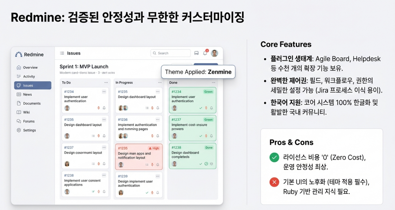 치명적 단점 Redmine의 가장 큰 약점은 UI의 노후화입니다. 기본 인터페이스는 2010년대 초반 스타일이라, 최신 도구에 익숙한 사용자들이 심리적 장벽을 느낄 수 있습니다. 이를 극복하기 위해서는 'Zenmine'이나 'PurpleMine2'와 같은 현대적인 반응형 테마를 적용하는 것이 필수적입니다.