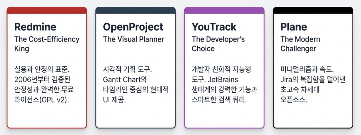 수많은 대안 중에서도 가장 유력한 후보인 Redmine, OpenProject, YouTrack, Plane이라는 네 가지 프로젝트 관리 도구의 특징을 초보자의 눈높이에서 알기 쉽게 비교 분석합니다. 이 가이드를 통해 각 도구의 장단점을 명확히 파악하고, 우리 팀의 상황에 꼭 맞는 최적의 선택을 내리는 데 도움을 드리는 것이 이 문서의 목표입니다.