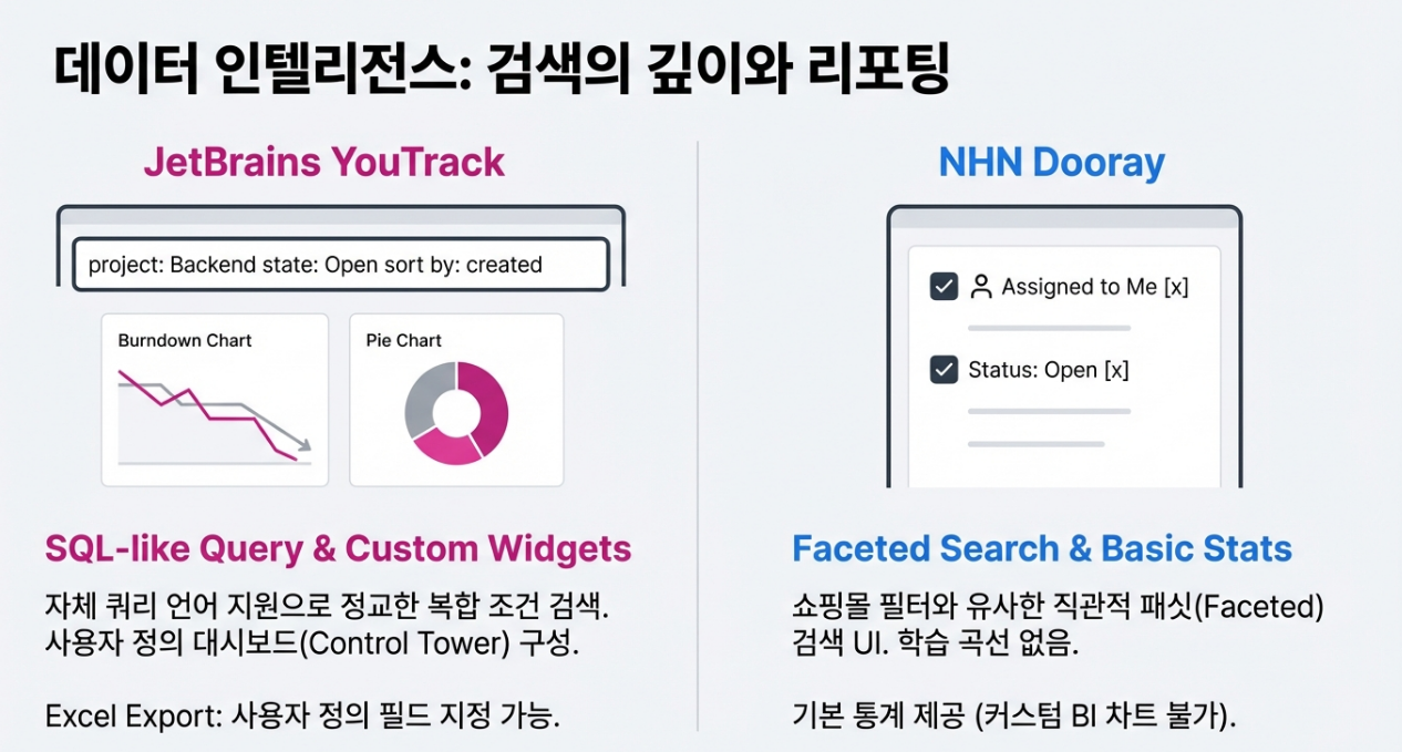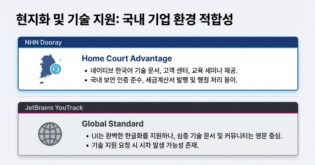 - 핵심 근거: JIRA 도입 실패의 핵심 원인이 '사용성'과 '복잡도'에 있었다면, YouTrack 역시 동일한 문제를 겪을 가능성이 높습니다. Dooray는 메신저와 결합된 직관적인 UI로 비개발 직군의 적응을 돕고, 메일, 화상회의까지 통합하여 하나의 도구로 모든 업무를 처리하는 강력한 편의성을 제공합니다. 이는 전사적 도입 성공률을 높이는 가장 현실적인 대안이며, 안정적인 한국어 지원 역시 큰 장점입니다.