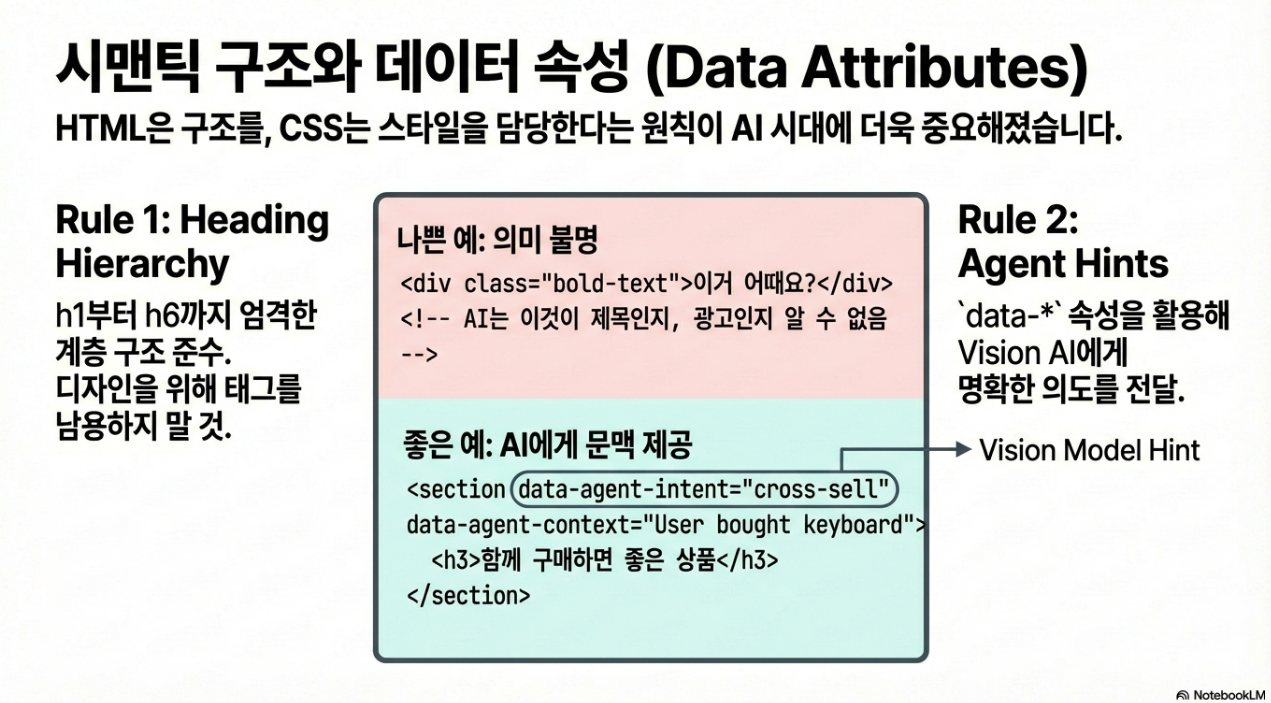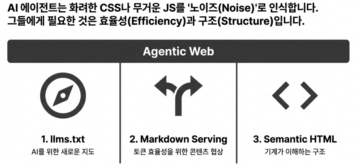 - AI 에이전트: 인간에게 매력적인 이런 시각적 요소들을 그저 정보 추출을 방해하는*'노이즈(Noise)'로 인식합니다. AI는 오직 명확한 구조, 정확한 데이터, 그리고 기계가 읽기 좋은 형식(Machine Readability)을 선호합니다.