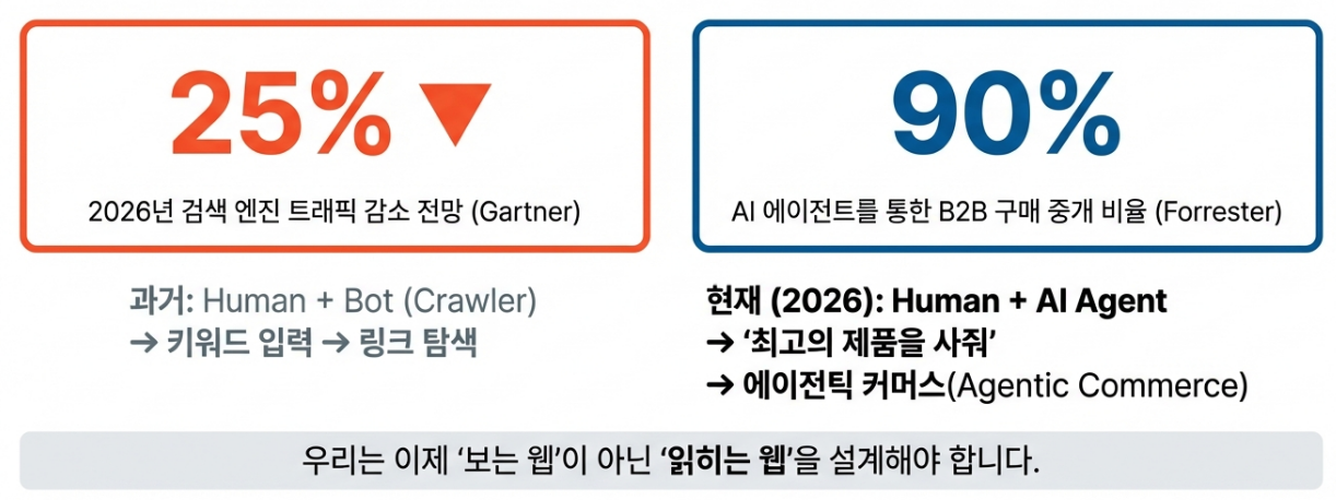 "웹사이트가 더 이상 인간의 눈만을 위한 '쇼윈도'가 아니라, 기계가 읽고 해석하여 행동할 수 있는 '데이터베이스'이자 'API'로서 기능해야 함을 의미합니다."
