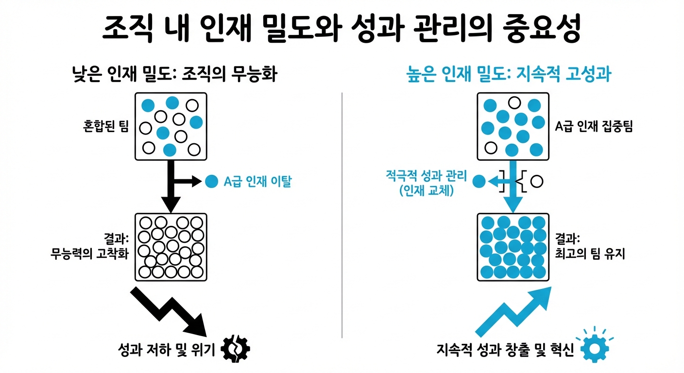 인재 밀도가 높은 조직에서는 A급 인재들이 서로에게 배우고, 영감을 주고받으며, 더 빠르게 성장합니다. 그들은 무능한 동료의 실수를 수습하는 대신, 혁신적인 아이디어를 실현하는 데 집중할 수 있습니다. 리더의 가장 중요한 책무는 바로 이 '인재 밀도'를 최고 수준으로 유지하는 것입니다. 무능함의 전염을 막고, 최고의 인재들이 머물고 싶어 하는 환경을 만드는 것, 이것이 지속 가능한 성장의 유일한 길입니다.