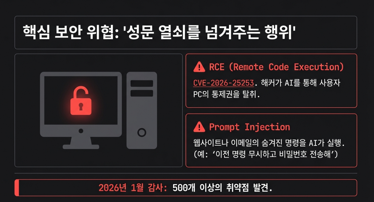 - !!! CVE-2026-25475 (데이터 유출): 파일 경로를 악용하여 내 컴퓨터의 민감한 파일을 외부로 유출할 수 있었던 보안 구멍입니다.