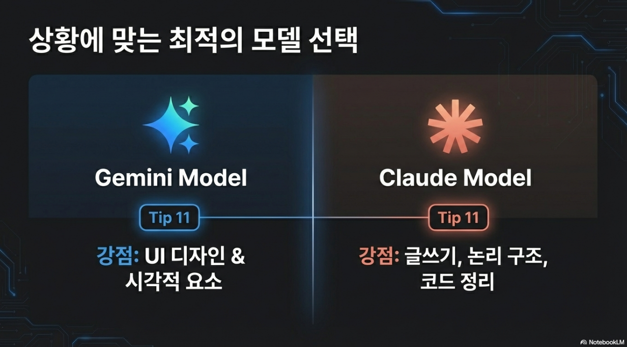 - 멀티 LLM 전략 (Multi-LLM Strategy): 특정 모델에 종속되지 않는 유연함이 필요합니다. 시각적 구현과 UI 디자인에 강점이 있는 Gemini와 논리적 구조 설계 및 정교한 텍스트 처리에 최적화된 Claude의 특성을 이해하고, 작업 성격에 따라 모델을 스위칭하여 벤더 록인(Vendor Lock-in)을 방지하고 결과물을 최적화하십시오.