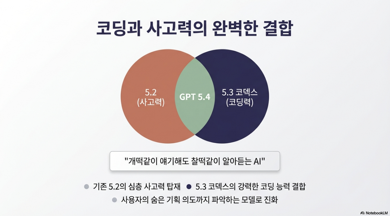 GPT 5.4의 가장 큰 기술적 진보는 기존에 분리되어 있던 강점들을 하나로 통합했다는 점입니다. 코딩에 특화된 '5.3 코덱스(Codex)' 모델과 심도 있는 사고 능력을 갖춘 '5.2 모델'이 결합하여 하나의 완성된 지능으로 탄생했습니다.