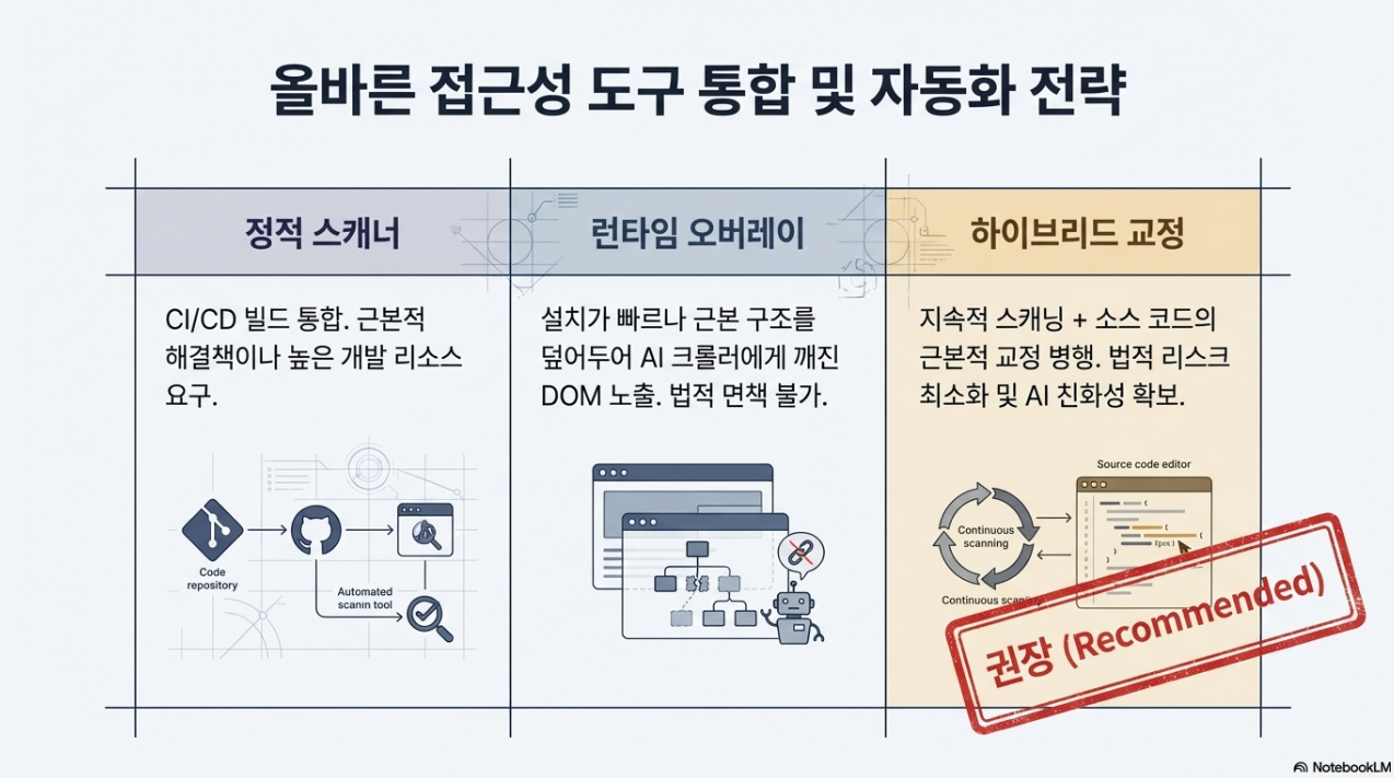 단순히 겉모습만 바꾸는 오버레이 위젯을 설치하는 것은 근본적인 해결책이 될 수 없으며 오히려 성능에 악영향을 줍니다. CI/CD 파이프라인에 통합된 Axe DevTools 같은 도구를 통해 소스 코드 레벨에서부터 시맨틱 무결성을 확보해야 합니다.