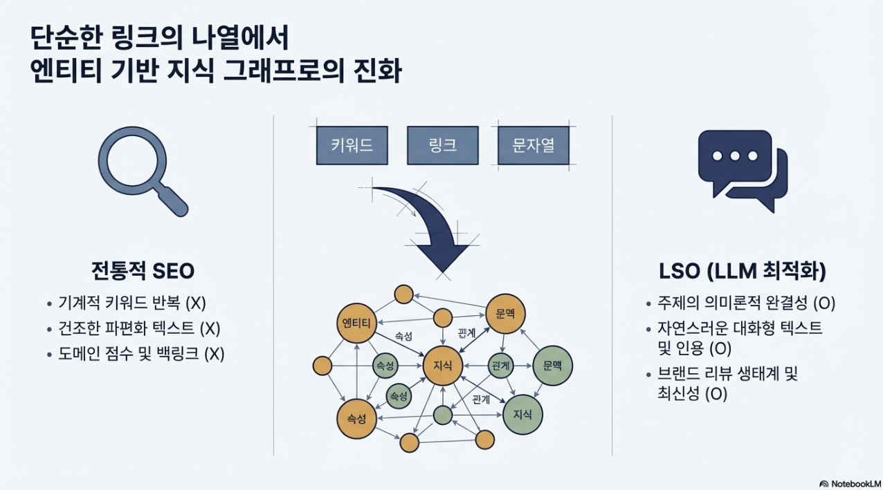 기존의 SEO가 키워드 밀도와 백링크에 의존했다면 LSO는 정보의 의미론적 완결성을 따집니다. 인위적인 키워드 반복은 오히려 AI의 문맥 이해를 방해하며 신뢰도 점수를 깎아먹는 독이 될 뿐입니다.