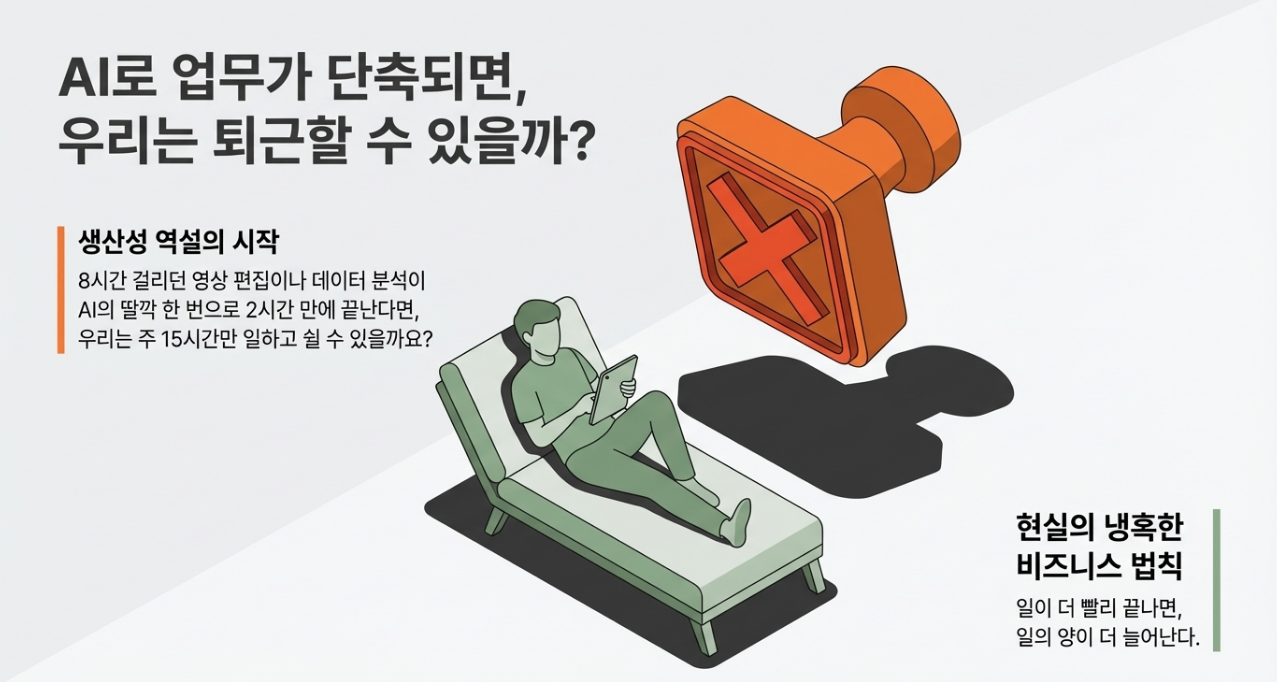 이는 마치 물리학의 F = ma와 같은 '어른들의 법칙'입니다. 8시간 걸리던 영상 편집을 AI가 2시간 만에 끝내면, 상사는 "남는 6시간 동안 쉬어라"라고 말하지 않습니다. "그럼 남은 시간에 영상 3개를 더 만들 수 있겠네?"라고 말하죠.