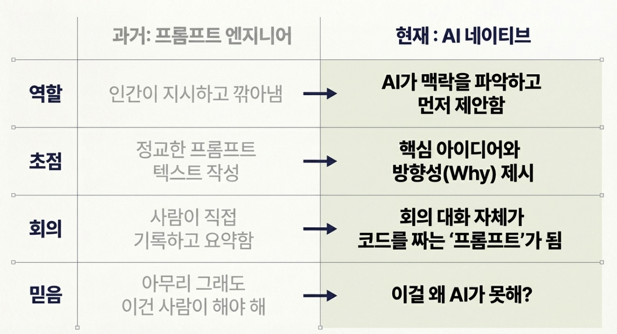 이제 중요한 것은 프롬프트의 정교함(Syntax)이 아니라, 아이디어와 '왜 이 일을 해야 하는가'에 대한 맥락(Context)입니다. 인간이 '수행'의 짐을 AI에게 넘기고 '설계와 결정'의 영역으로 완전히 이동하는 것, 이것이 실리콘밸리가 주목하는 AI 네이티브의 핵심입니다.