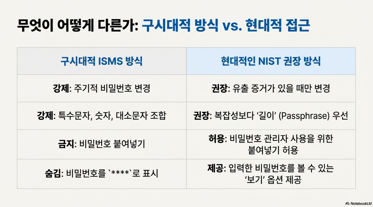 그렇다면 왜 우리는 아직도 낡은 관행에 시달리고 있는 걸까요? 문제는 'ISMS(정보보호 관리체계)'라는 인증 제도에 있습니다. 연간 매출 100억 원 이상의 기업은 의무적으로 이 인증을 받아야 합니다. 그런데 이 ISMS 인증을 받기 위한 가이드북에 여전히 과거의 낡은 비밀번호 규칙이 남아있습니다. 개발자 입장에서는 천만 원 가까운 심사비를 내고 인증을 받는 과정에서 심사위원과 마찰을 빚기 싫어, 어쩔 수 없이 가이드라인을 그대로 따르는 경우가 많습니다. 결국 사용자의 불편은 계속되는 셈입니다.