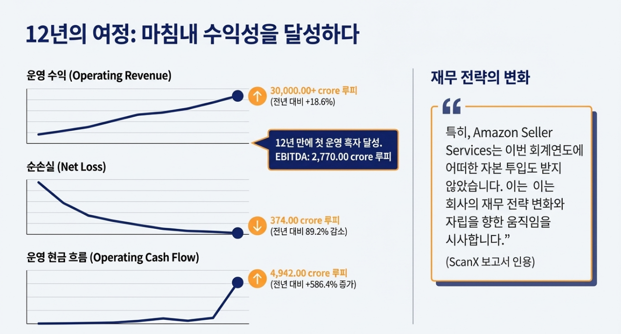 아마존의 인도 시장 진출 역사에서 매우 중요하고 놀라운 이정표가 세워졌습니다. 마켓플레이스 사업부인 아마존 셀러 서비스(Amazon Seller Services)가 설립 12년 만에 처음으로 영업이익을 기록한 것입니다. 이는 인도 전자상거래 시장과 아마존의 사업 모델이 성숙기에 접어들었음을 보여주는 결정적인 순간입니다.