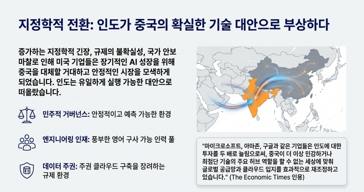 이러한 투자 급증은 지정학적 배경과도 맞물려 있습니다. 지난 20년간 중국이 글로벌 디지털 확장의 중심지였지만, 고조되는 지정학적 긴장, 규제의 예측 불가능성, 국가 안보 마찰로 인해 미국 기업들은 장기적인 AI 성장을 위한 안정적인 대안 시장을 모색하게 되었습니다. 인도는 이러한 상황에서 유일하게 실행 가능한 대안으로 부상했습니다.