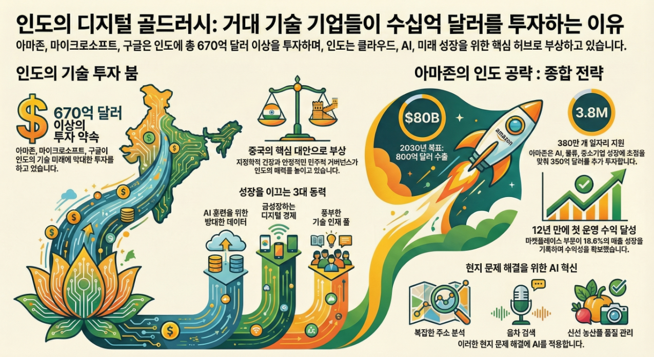 인도 시장에 대해 이야기할 때 흔히 아웃소싱이나 거대한 소비자 확보 시장을 떠올립니다. 하지만 이러한 인식은 이제 과거의 이야기가 되었습니다. 최근 아마존, 마이크로소프트, 구글이 단기간에 인도에 약속한 투자액은 총 670억 달러를 넘어섭니다. 이 천문학적인 액수는 단순한 시장 진출을 넘어선, 훨씬 더 깊은 전략적 변화를 의미합니다.