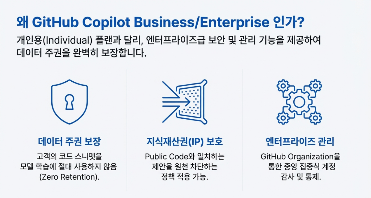 기업이 Copilot 도입을 가장 망설이는 이유는 ‘내부 코드가 AI 모델 학습에 사용될 것’이라는 우려 때문입니다. 결론부터 말하자면, GitHub Copilot Business 플랜에서는 절대 그런 일이 일어나지 않습니다.