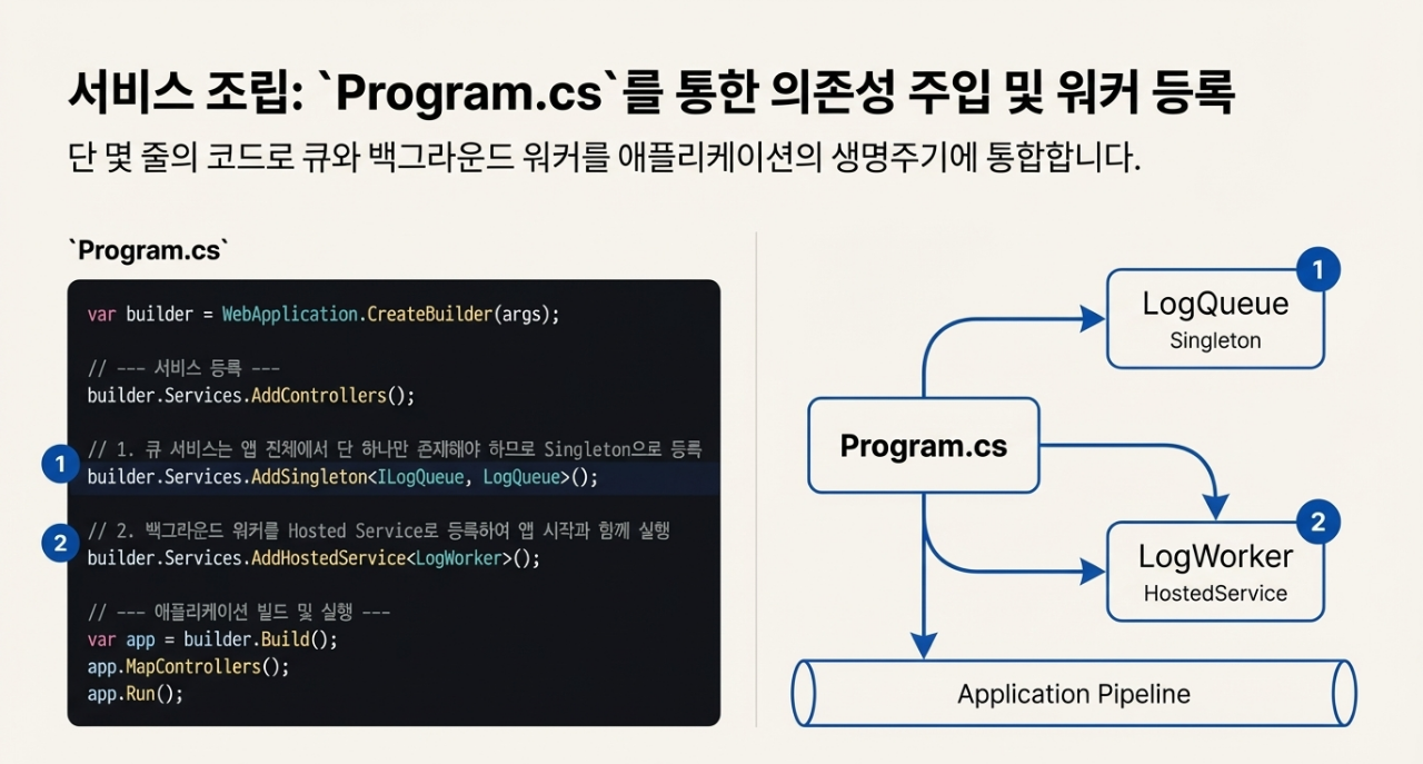 - 싱글톤 등록: LogQueue 서비스는 DI(의존성 주입) 컨테이너에 반드시 Singleton으로 등록되어야 합니다. 이는 API 서버 애플리케이션 전역에서 단 하나의 큐 인스턴스만을 공유하도록 보장하여, 모든 로그 요청이 동일한 파이프라인을 통해 처리되게 합니다.