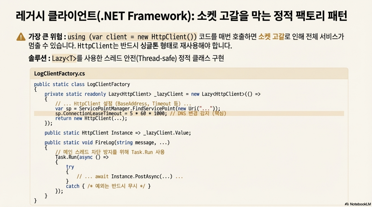 - 정적 팩토리 패턴 (Static Factory Pattern): 이 문제에 대한 검증된 해결책은 HttpClient 인스턴스를 애플리케이션 전역에서 하나만 유지하는 싱글톤 패턴을 적용하는 것입니다. Lazy<T>를 사용하여 스레드에 안전한(thread-safe) 방식으로 싱글톤 인스턴스를 생성하고 제공하는 LogClientFactory와 같은 정적 클래스를 구현합니다.