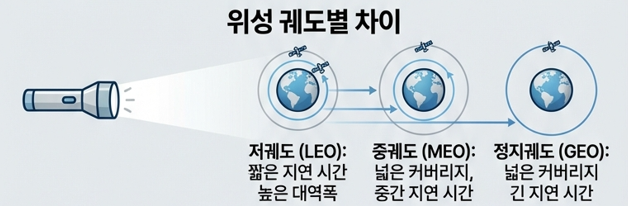 스타링크는 '저궤도(LEO)' 위성을 사용해요. 지구에서 약 550km 정도 떨어진 곳이죠 . 위성 궤도는 고도에 따라 특성이 달라요. 정지궤도 위성(36,000km)이 넓은 지역을 커버하지만 느린 통신(High Latency)을 한다면 , 저궤도 위성은 지구와 가까워서 통신 지연 시간이 짧고 아주 빨라요(Low Latency) . 벽에 가까이 댄 손전등처럼 빛이 좁은 영역에 집중되지만 신호가 강한 것과 비슷하죠 .