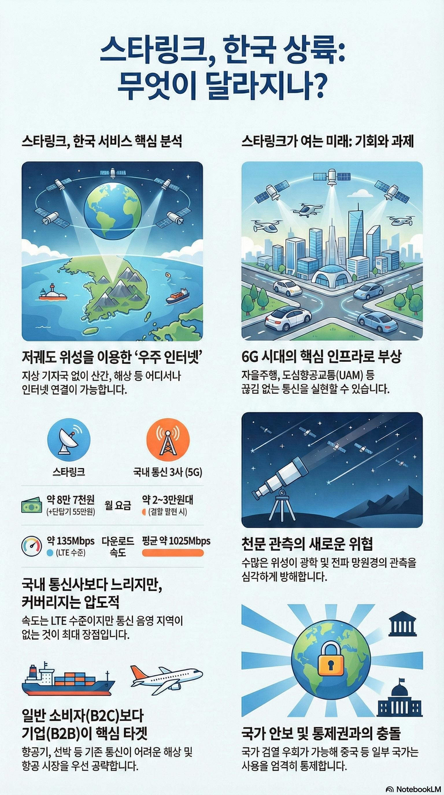 먼저, 배 위에서의 통신이 혁신되고 있어요. 기존 통신이 안 되던 원양어선이나 상선들도 바다 한가운데서 안정적인 인터넷을 쓸 수 있게 되었죠 . 국내 선사인 팬오션이 스타링크 도입 계약을 체결한 것이 대표적인 예예요 . 그리고 비행기에서도 끊김 없는 고속 와이파이를 쓸 수 있게 돼요 . 대한항공 같은 주요 항공사들도 장거리 노선에 도입을 계획하고 있어요 . 마지막으로 재난 통신망 역할도 중요해요. 지진이나 전쟁 같은 재난으로 지상 통신망이 망가졌을 때, 스타링크는 필수적인 백업 통신망이 될 수 있거든요 . 이는 국가 안보 차원에서도 매우 중요해요 .