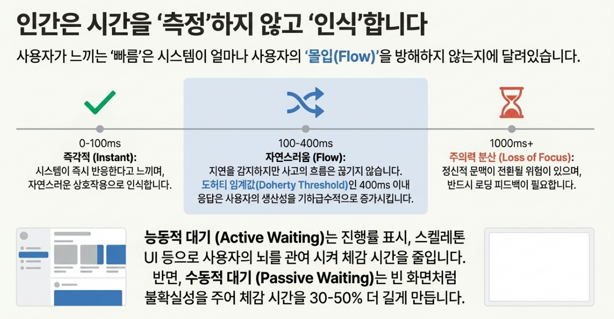 사용자의 체감 속도를 설계하기 위해서는 기술적 수치 이전에 인간이 시간을 어떻게 인지하는지에 대한 심리학적 이해가 선행되어야 합니다. 사용자가 느끼는 '빠름'은 데이터 전송 속도가 아니라, 시스템이 사용자의 몰입(Flow)을 방해하지 않고 얼마나 즉각적인 피드백을 제공하는지에 달려 있습니다. 이 장에서는 체감 성능 설계의 기반이 되는 핵심 심리학 원칙들을 분석합니다.