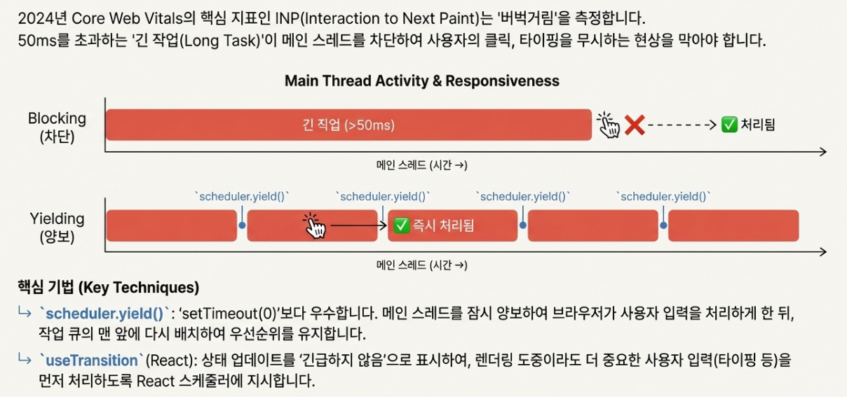 2024년 3월, INP(Interaction to Next Paint)가 Core Web Vitals의 공식 지표로 채택되면서 인터랙션 반응성의 중요성이 더욱 커졌습니다. 사용자가 "버벅거린다"고 느끼는 경험은 대부분 브라우저 메인 스레드의 블로킹(Blocking) 현상 때문에 발생합니다. 즉각적인 체감 성능을 위해서는 메인 스레드를 현명하게 제어하는 기술이 필수적입니다.